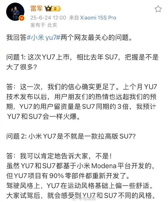 #雷軍否認小米YU7是放大版SU7# 雷軍稱90%零部件都是重新開發,網友:造車沒那么容易。