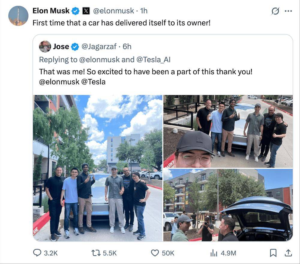 特斯拉的首席執行官馬斯克在社交媒體上興奮地宣布了這一消息,稱這是自動駕駛技術邁出的歷史性一步。他強調,這是首次在公共高速公路上進行的、車內及遠程均無人操作的完全自動駕駛行程。