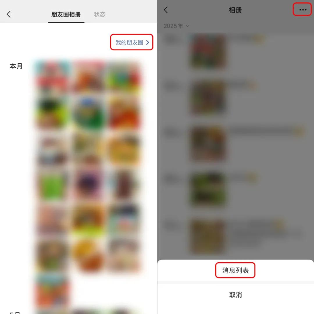 該功能藏得比較深,首先需要打開微信“我-朋友圈-我的朋友圈”,點擊“相冊”右上角“···”,進入“消息列表”。