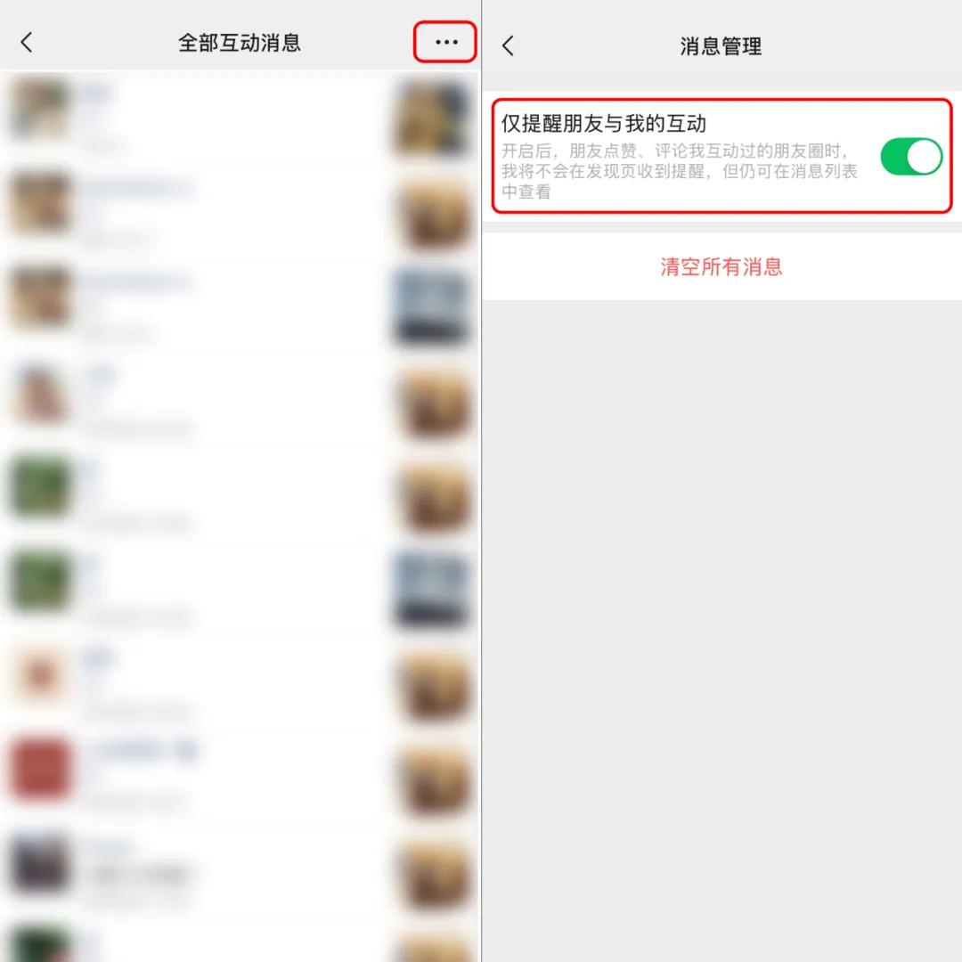 然后,繼續點擊右上角“···”,在“消息管理”中,就能看到“僅提醒朋友與我的互動”開關了。