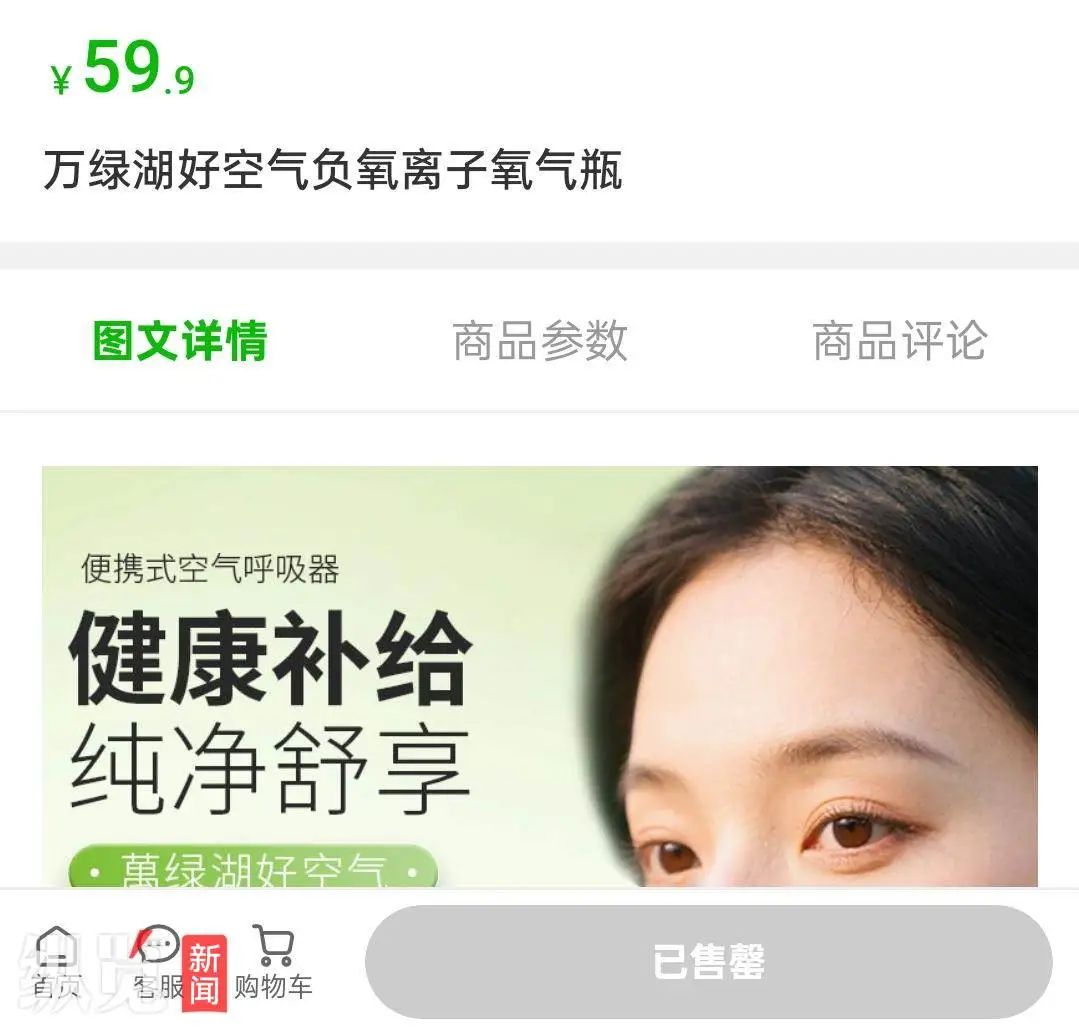 微信店鋪里萬綠湖好空氣負氧離子氧氣瓶已售罄。(來源/東源手信小程序)