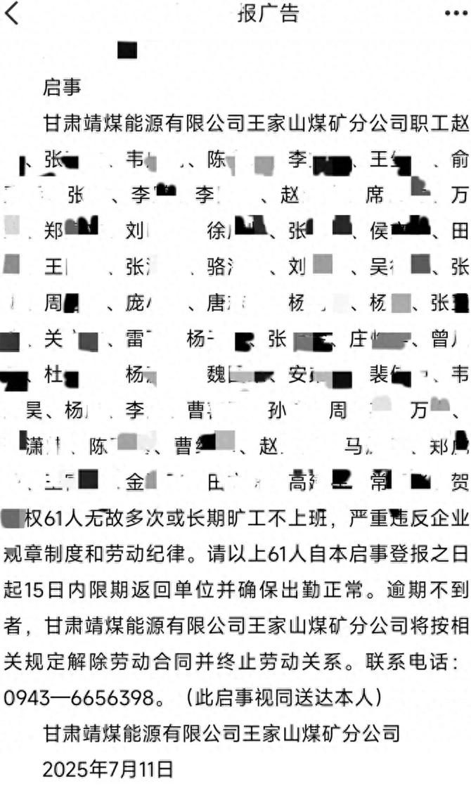 極目新聞消息,甘肅靖煤能源有限公司王家山煤礦分公司在《甘肅日報》刊登啟事,責令61名無故多次或長期曠工的職工15日內返崗,否則將解除勞動合同。