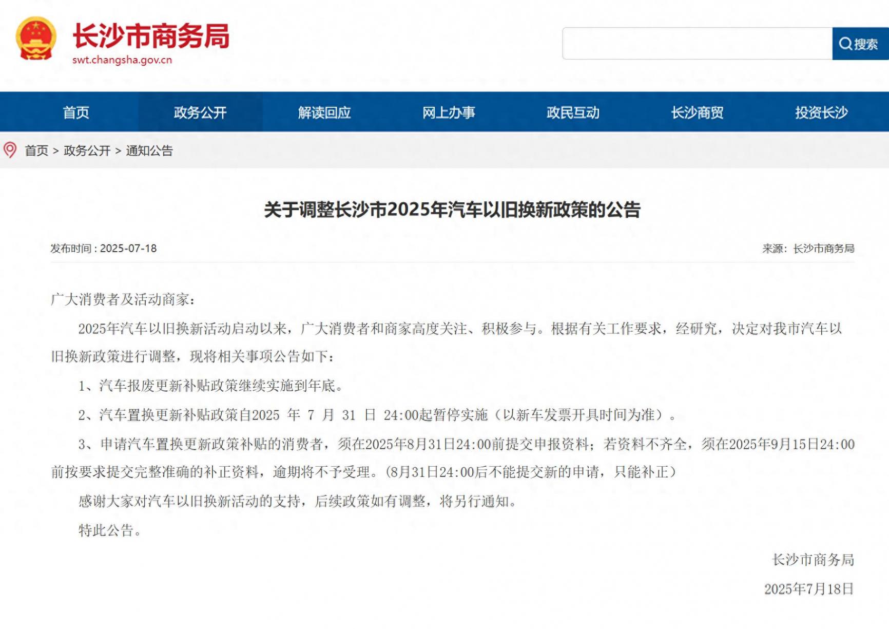 7月18日晚,長沙、衡陽市商務(wù)局分別發(fā)布2025年汽車以舊換新政策的調(diào)整公告。