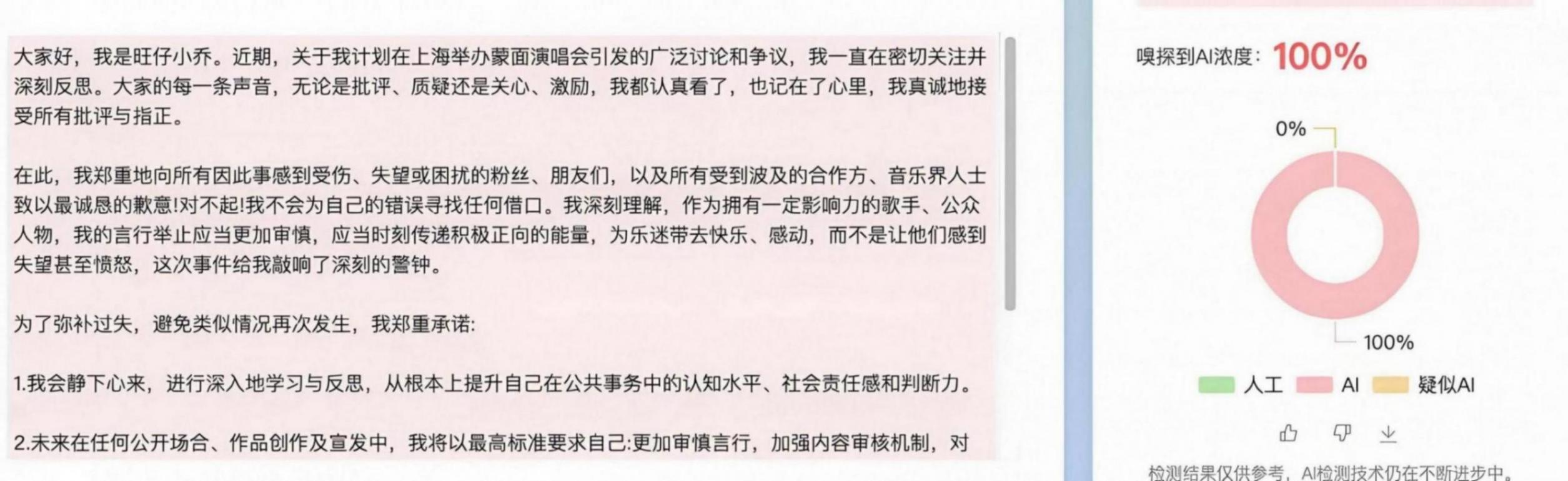 有不信邪的網(wǎng)友,本著“科學(xué)求證”的精神,把這封本該是“情真意切”的道歉信,扔進(jìn)了AIGC的查重工具里。