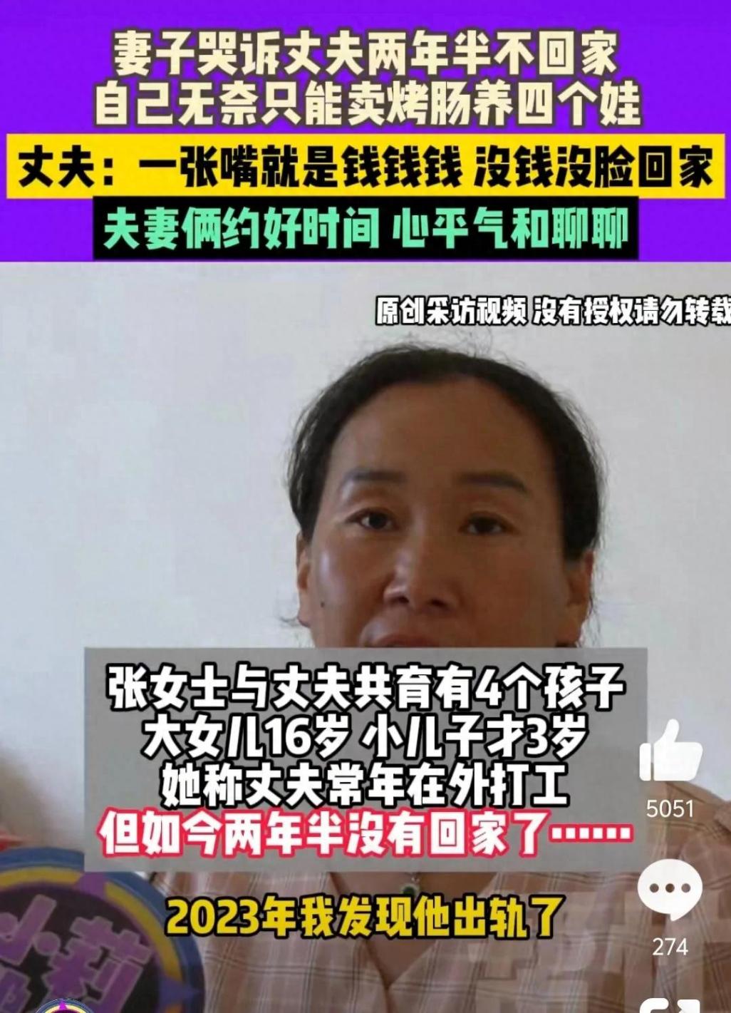 經(jīng)濟壓力成為夫妻矛盾的核心。張女士在電話里聽到丈夫總是提及錢的問題,甚至表示“沒錢就不給視頻看孩子”。這讓張女士倍感壓力,家庭開支主要靠賣烤腸來維持。