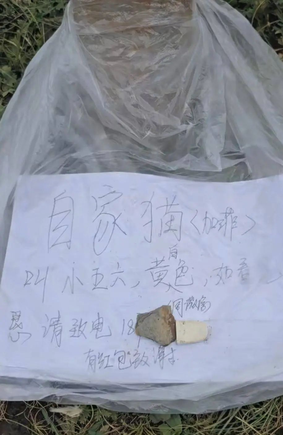 視頻畫面顯示,在土撥鼠洞穴附近,有一張被石頭壓住的紙條,寫著:“自家貓(加菲),叫小五六,黃白色,如看見懇請致電,有紅包致謝。”對于網友“為何不把洞挖開”的疑問,發帖網友解釋稱“洞太多、太長,不好挖”。
