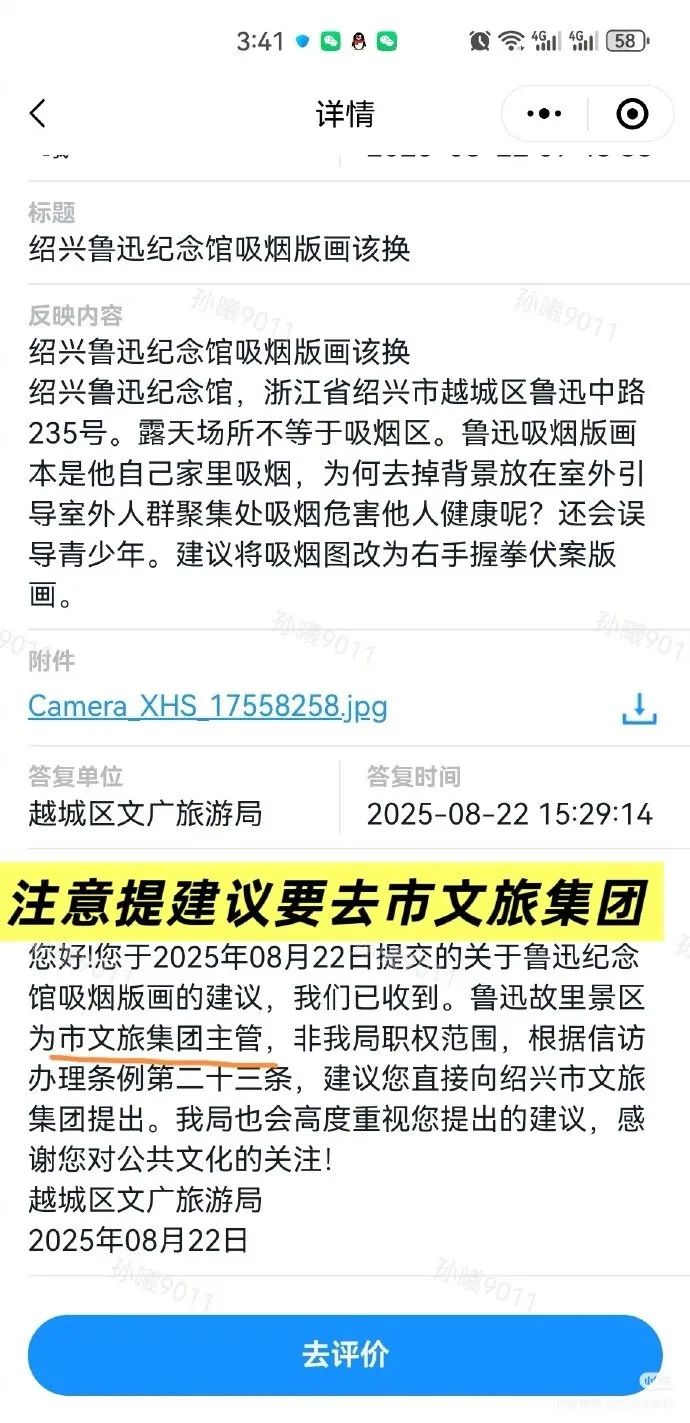 孫女士投訴紹興魯迅紀念館網紅墻畫的理由是,該畫的原畫是魯迅在自己家里抽煙,墻畫去掉背景,有引導人室外聚集抽煙危害他人健康的風險,同時還會誤導青少年,于是要求對墻畫進行更換。越城區文廣旅游局的回復稱:“魯迅故里景區為市文旅集團主管,非我局職權范圍,建議您直接向紹興市文旅集團提出。”