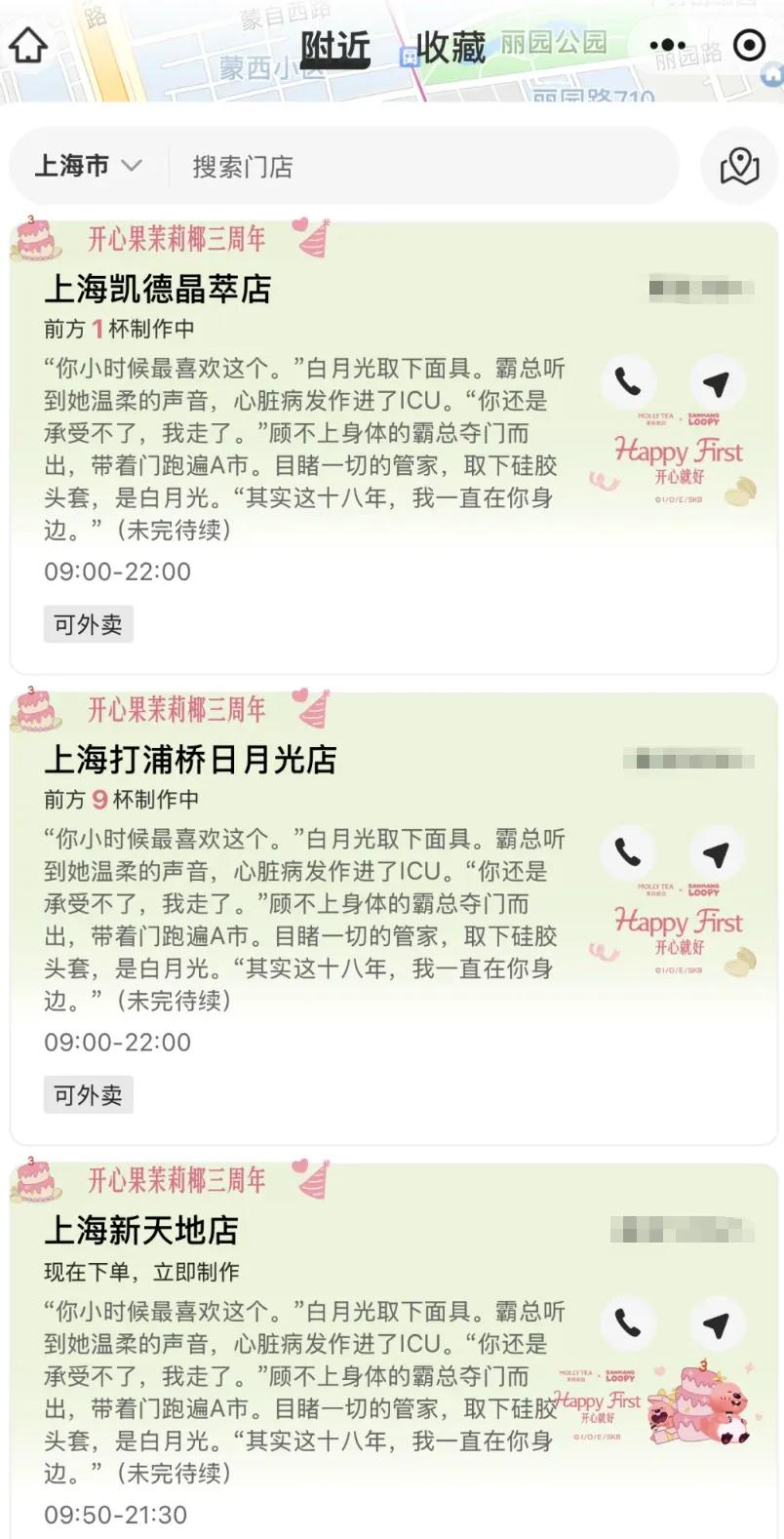 除了外賣小票,上海門店的簡介也成功 “變身” 霸總小說現場。全國不少門店更是緊跟潮流,將小程序簡介改造成了小說的 “第二戰場”。一時間,點奶茶仿佛變成了逛小說網站,充滿了驚喜與期待。