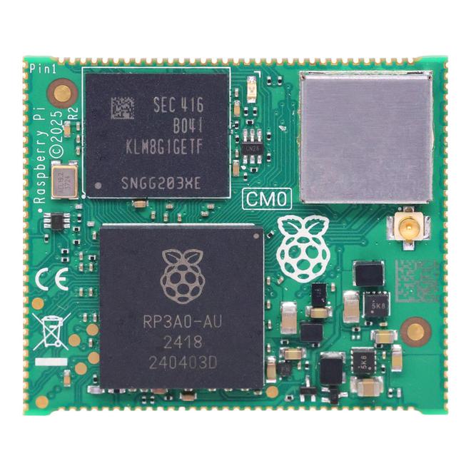 Raspberry Pi CM0 尺寸 39mm×33mm,配備四核 Arm Cortex-A53 @ 1GHz 處理器和 512MB LPDDR2 內存,空閑功耗約 1W、滿載約 3W,支持選配 eMMC 閃存和 Wi-Fi + 藍牙無線模塊。