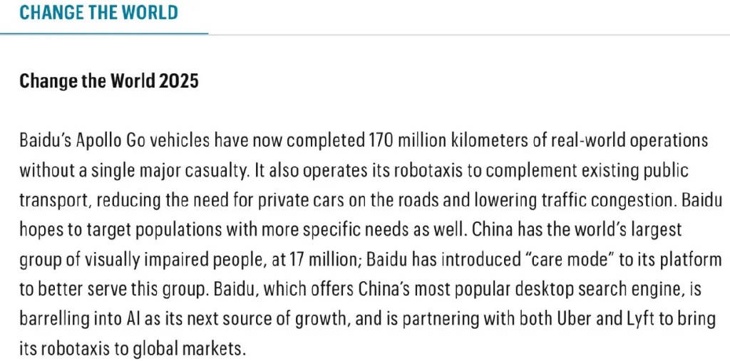 從《財富》對蘿卜快跑的評語里,能看到其獲入選的落點,放在“改變出行文明”上。