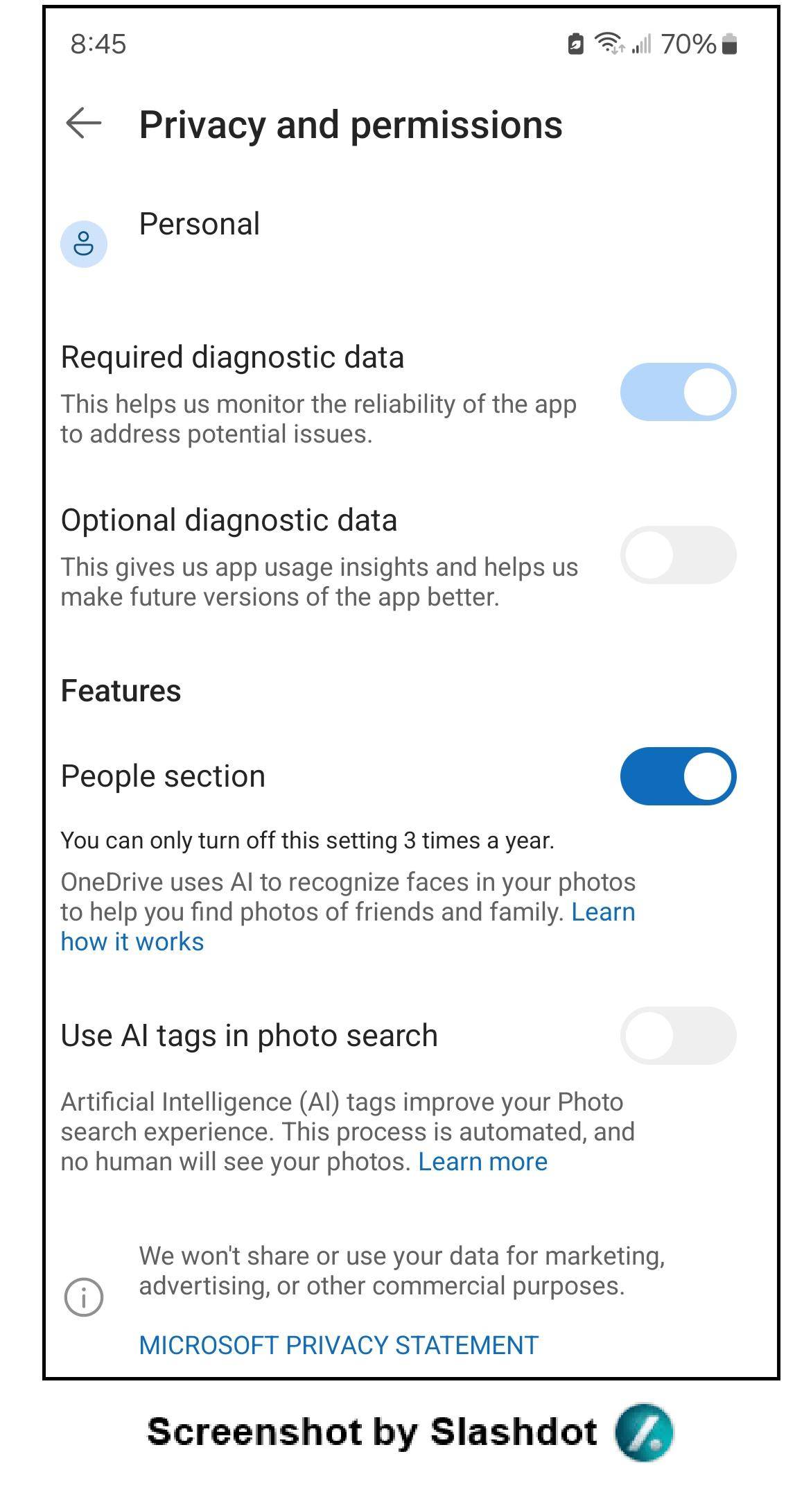昨日,Slashdot 網(wǎng)站刊登了一篇編輯親歷報道:當他從手機本地存儲上傳一張照片至微軟 OneDrive 云存儲服務后,發(fā)現(xiàn)隱私與權限頁面中出現(xiàn)了一個“人物”(people)區(qū)域的退出選項,提示寫道:“OneDrive 使用人工智能識別您照片中的人臉,以幫助您查找親友的照片。”然而,當他試圖關閉此功能時,一條聲明顯示:“您每年只能關閉此設置三次。”