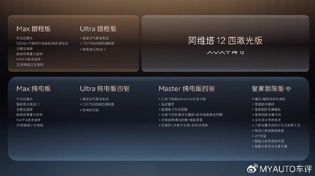 阿維塔12 四激光版提供純電與增程雙動力,全面覆蓋用戶多元出行場景。純電動后驅版CLTC續航里程可達755km,從容應對跨城出行;四驅版0-100km/h加速僅需3.8s,性能媲美4.0T V8發動機,帶來酣暢淋漓的駕駛體驗。增程版全系標配52kWh大容量度寧德時代驍遙超級增·混電池,CLTC純電續航里程356km,輕松實現“一周一充”的城市純電通勤自由;綜合續航里程更突破1270km,配合5C峰值充電倍率,電量從30%充至80%僅需10分鐘,一杯咖啡的時間便可完成補能,帶來“增程體驗更純電,續航表現更燃油”的無憂體驗。此外,新車底盤系統也進行了重要升級,針對空懸版車型進行了底盤優化與精細化調校,舒適性與操控性同步提升,面對復雜路況也能從容自若。