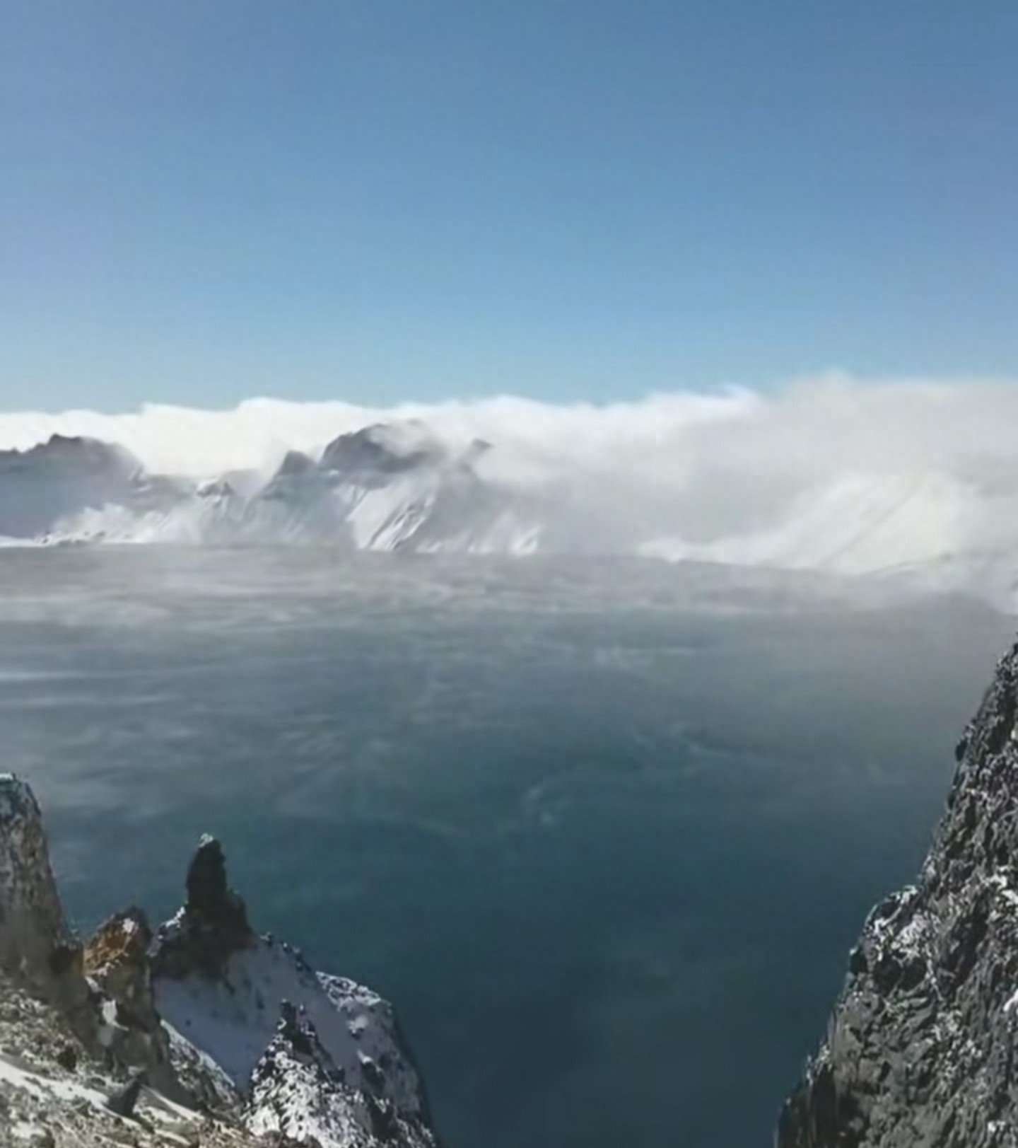 冬日長白山巔,天池湖面蒸汽翻騰,宛如一鍋沸騰的開水,與四周冰雪世界形成震撼對比,游客驚呼“人間仙境”。