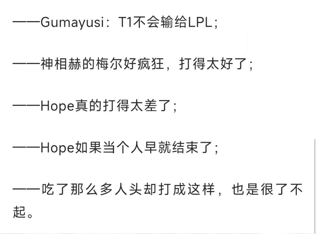 對于Hope在本輪系列賽的發(fā)揮表現(xiàn),甚至引起了部分韓國網(wǎng)友和業(yè)內(nèi)人士的一致嘲諷和吐槽!前T1輔助選手Wolf,在復(fù)盤比賽時坦言,Hope確實打的有點菜,然而T1并不是由于對手太菜才贏的,只是因為打得更好。與此同時,很多韓國網(wǎng)友更是發(fā)言嘲諷Hope,直言但凡Hope還能當(dāng)個人,AL都贏下比賽了,同時不禁提出質(zhì)疑,2-0開局的金克斯,究竟是如何輸?shù)舯荣惖模繉Υ擞芯W(wǎng)友表示,就連作為LPL對手的韓國粉絲都看不下去了,紛紛對其進(jìn)行“公開處刑”,Hope明年如果再不離開AL的話,真的說不過去了。