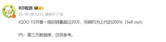 在vivo X300系列之外iQOO 15也賣爆了,信息顯示iQOO 15開售當(dāng)天就賣了近6萬臺,同比增長100%。開售三天賣了13萬臺以上,是iQOO 13的200%,也是增長100%。開售一周賣了20萬臺上,同比iQOO 13也是增長100%。換言之相對去年同期的iQOO 13,這一代的iQOO 15銷量是直接翻倍的。而在10月30日才發(fā)布的iQOO Neo11目前也是熱賣的情況,來自官方的數(shù)據(jù)顯示iQOO Neo11首銷30分鐘銷量是上代的200%,也是增長100%,也是翻了一倍。由于這款機(jī)型剛剛發(fā)布開售,第三方數(shù)據(jù)還沒有出來。不過既然官方敢發(fā)戰(zhàn)報,那就意味著這一代也成為了爆品。
